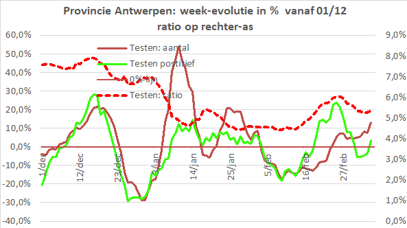 Evolutie-% testen, positief, ratio en ratio