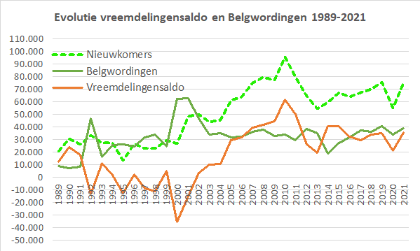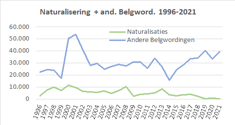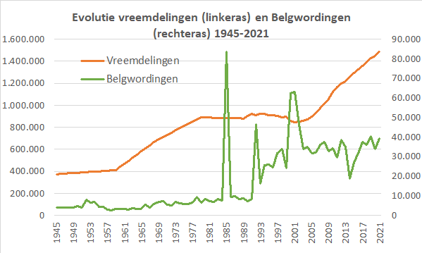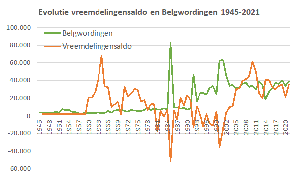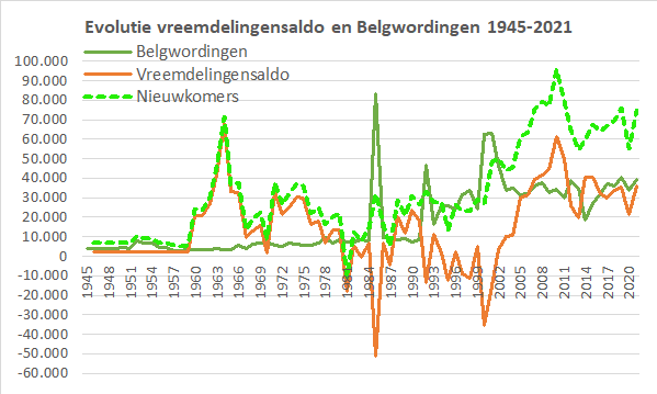 We hernemen de grafiek die dit het best illustreert met evolutie van het aantal vreemdelingen (linkeras) en de Belgwordingen (rechteras). Het geeft de onontkoombaarheid, noodzaak en wenselijkheid aan van een alsmaar groeiend aantal Belgwordingen de komende jaren. De huidige noodzaak aan nieuwe immigratie omwille van de (tijdelijke) stijging van de arbeidsbehoefte zal deze noodzaak tot Belgwording voor het hele komende decennium verzekeren. De integratie wordt daarmee meer en meer gerealiseerd. Vooral ook de politieke deelname van inwoners met migratieachtergrond, nu reeds geconsolideerd in de grotere steden, uitdeinend naar de kleinere steden en landelijke gemeenten. Dit omwille van verhuizing en nieuwe immigratie en het alsmaar groter wordend aantal leegkomende woningen, die door hen gehuurd of aangekocht worden, en opgeknapt en vernieuwd. Elke Belgische burger kan dit dagelijks in z'n straat, gemeente en regio vaststellen wanneer hij er te voet, per fiets, met de wagen of het openbaar vervoer langskomt. Zo werden en worden migranten, inwoners met migratieachtergrond een essentieel en onvervangbaar deel van het 'eigen volk'. Uitnodiging tot debat/dubbelinterview met Filip De Winter en/of Sam van Rooy over hun recente publicaties in boek of bij Doorbraak. Met vriendelijke groeten, Jan