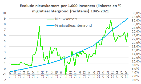Na het coronajaar 2020 komen migratie, Belgwordingen en nieuwkomers op het niveau van voor corona. In onderstaande grafiek wordt de evolutie van nieuwkomers uitgezet als aantal op 1.000 Belgen tussen 1945 en 2021 op 31/12/2021. Het geeft in feite situatie weer tot 01/01/2022 op de linkeras. Op de rechteras geven we de evolutie van het aantal inwoners met migratieachtergrond in België, dwz vreemdelingen+Belg geworden vreemdelingen en hun natuurlijk- en migratiesaldo.