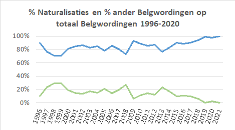 Naturalisering werd door de regering Michel verminkt en gereduceerd tot een uitzonderlijke procedure,nl "tot wie aan België buitengewone verdiensten bewezen hebben op wetenschappelijk, sportief of sociocultureel vlak waardoor u een bijzondere bijdrage kunt leveren voor de internationale uitstraling van België". Niet geklaagd, met enige vertraging wegens de verstrenging van de verblijfsduur, blijft de Belgwording op eenzelfde hoog niveau, nadat door tussenkomst van de PS regering Di Rupo er even een duik naar onder gebeurde in 2014. Met Francken en de N-VA werd, tegen hun retoriek in, 'orde op zaken' gesteld en kwam de Belgwording terug op het voor de samenleving en de democratie noodzakelijke niveau als belangrijkste integratiekanaal en verzekering van gelijke rechten voor in België verblijvende vreemdelingen.