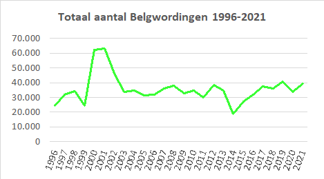 5. Gaan de Belgwordingen naar 50.000 in 2022 en zullen ze verder stijgen de volgende jaren? Elke maand kan de update gevolgd worden van het aantal Belgwordingen, met opgave van de 10 belangrijkste nationaliteiten op de site van het Rijksregister, samen met een heel aantal maandelijks bijgehouden items, zie Statistiek van de bevolking. De eerste vier maanden van 2022 bedroegen de Belgwordingen al meer dan 4.000. Wanneer het aantal aanwezige vreemdelingen in België uitgezet wordt (linkeras) naast de Belgwordingen (rechteras) dan wordt hun onderling verband en evolutie enigszins duidelijk. Vreemdelingen die Belg worden zijn niet meer aanwezig in de administratieve telling, maar hier worden wel de nieuwe vreemdelingen bijgeteld. Als het aantal vreemdelingen sneller stijgt dan het aantal Belgwordingen, wordt reeds aangegeven wat de toekomst van de Belgwordingen betreft. Hoe langer vreemdelingen in België verblijven, hoe meer ze er thuis zijn en tot het 'eigen volk' gaan behoren. Op de grafiek is duidelijk te zien dat de stabilisering van het aantal Belgwordingen na 2004 de stijging van het aantal vreemdelingen (mede omwille van enkele restricties vooral door PS en ook door de liberalen niet gevolgd is en in feite enkel vertraagd is. Het komende decennium zullen mede daarom de Belwordingen stijgend zijn. Door de bijkomende immigratie van vreemdelingen, omwille van de krapte op de arbeidsmarkt, zal de Belgwording een bijkomende versnelling kennen in de loop van het komende decennium.