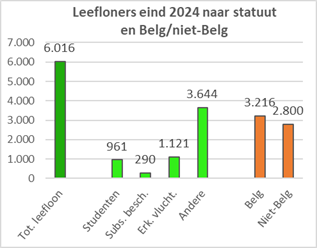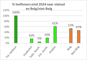 | België en gewesten | Bevolking 2024 | Erkende vluchte-lingen 1999-2024 | Erkende vluchtel. leefloon 2024 | % leefloon vluchtel. op totaal erkenden | Leefloon vluchtel. op 1000 inwoners | Aantal leefloners eind 2024 | % erkende vluchte-lingen op leefloners | % leefloners op de bevolking 2024 | ||||||||||||