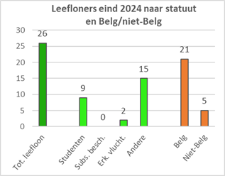 | België en gewesten | Bevolking 2024 | Erkende vluchte-lingen 1999-2024 | Erkende vluchtel. leefloon 2024 | % leefloon vluchtel. op totaal erkenden | Leefloon vluchtel. op 1000 inwoners | Aantal leefloners eind 2024 | % erkende vluchte-lingen op leefloners | % leefloners op de bevolking 2024 | ||||||||||||