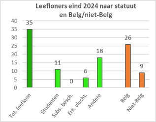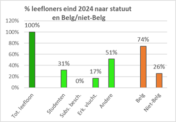 | België en gewesten | Bevolking 2024 | Erkende vluchte-lingen 1999-2024 | Erkende vluchtel. leefloon 2024 | % leefloon vluchtel. op totaal erkenden | Leefloon vluchtel. op 1000 inwoners | Aantal leefloners eind 2024 | % erkende vluchte-lingen op leefloners | % leefloners op de bevolking 2024 | ||||||||||||