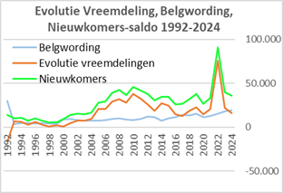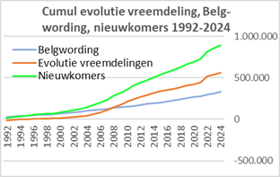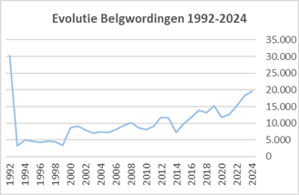 Evolutie Belgwordingen per decennium en 33 jaar |