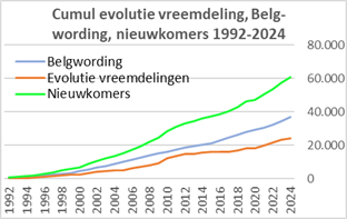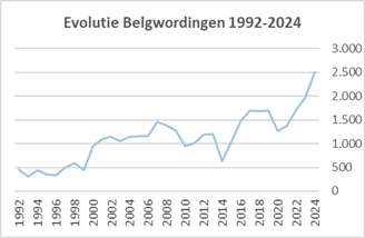 Evolutie Belgwordingen per decennium en 33 jaar |