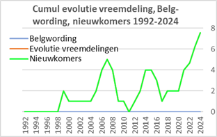 Evolutie Belgwordingen per decennium en 33 jaar |
