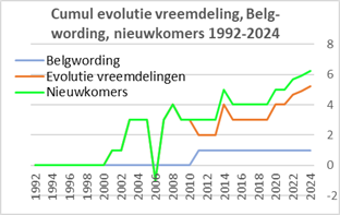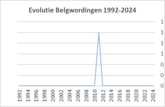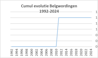 Evolutie Belgwordingen per decennium en 33 jaar |