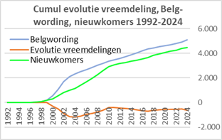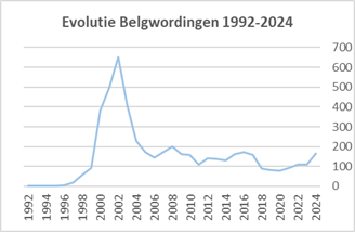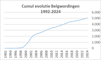 Evolutie Belgwordingen per decennium en 33 jaar |