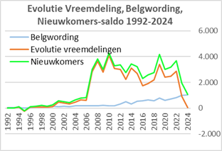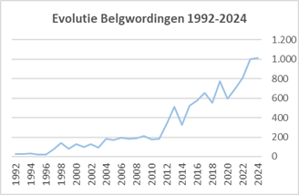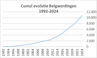 Evolutie Belgwordingen per decennium en 33 jaar |