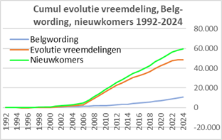 Evolutie vreemdelingen per decennium en 33 jaar |
