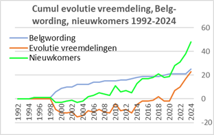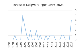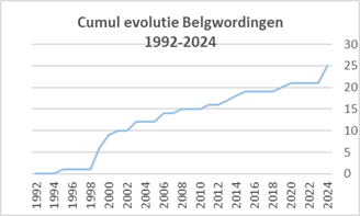 Evolutie Belgwordingen per decennium en 33 jaar |