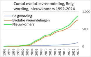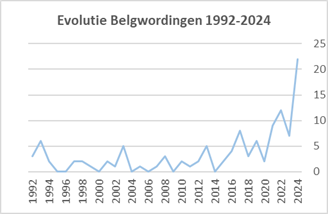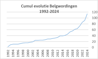 Evolutie Belgwordingen per decennium en 33 jaar |