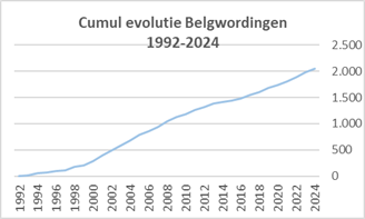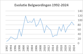 Evolutie Belgwordingen per decennium en 33 jaar |