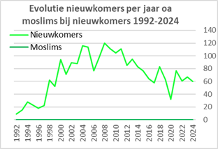 Evolutie nieuwkomers per decen. en 33 jaar |