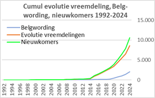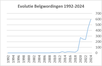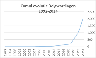 Evolutie Belgwordingen per decennium en 33 jaar |
