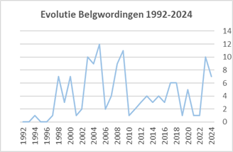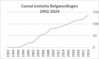 Evolutie Belgwordingen per decennium en 33 jaar |