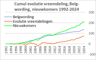 Evolutie vreemdelingen per decennium en 33 jaar |
