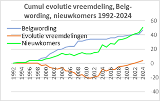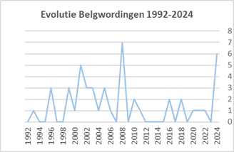 Evolutie Belgwordingen per decennium en 33 jaar |