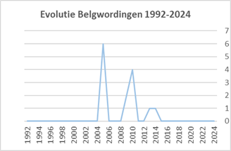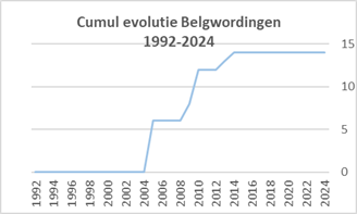 Evolutie Belgwordingen per decennium en 33 jaar |