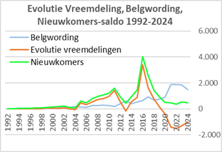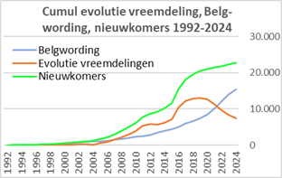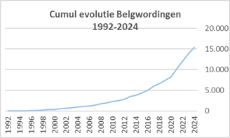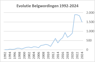 Evolutie Belgwordingen per decennium en 33 jaar |