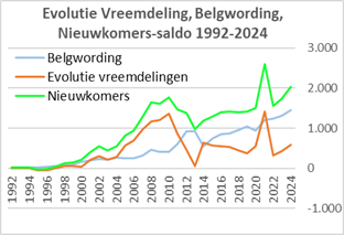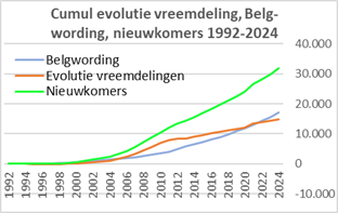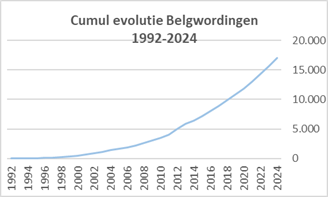 Evolutie Belgwordingen per decennium en 33 jaar |