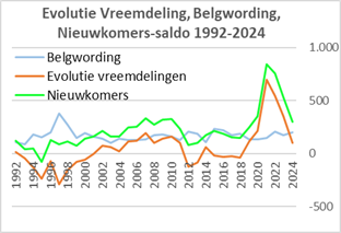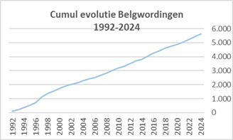 Evolutie Belgwordingen per decennium en 33 jaar |