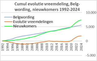 Evolutie vreemdelingen per decennium en 33 jaar |