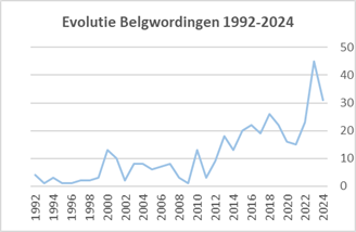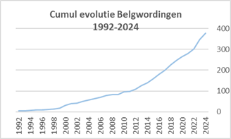 Evolutie Belgwordingen per decennium en 33 jaar |