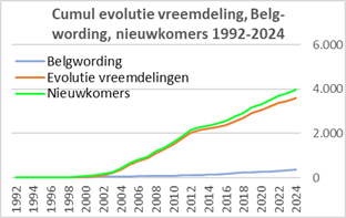 Evolutie vreemdelingen per decennium en 33 jaar |