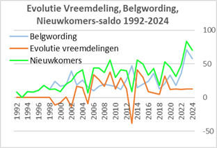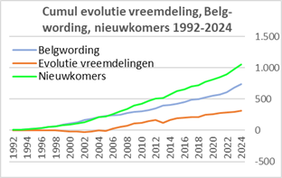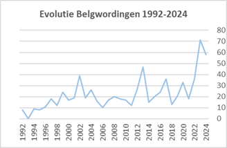 Evolutie Belgwordingen per decennium en 33 jaar |