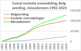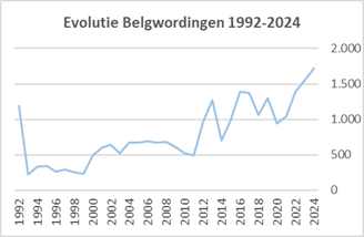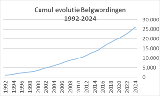 Evolutie Belgwordingen per decennium en 33 jaar |