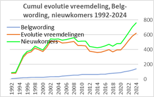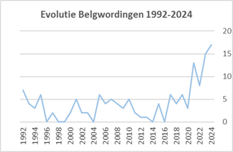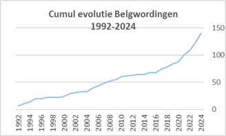 Evolutie Belgwordingen per decennium en 33 jaar |