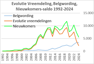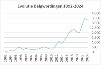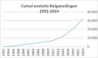 Evolutie Belgwordingen per decennium en 33 jaar |
