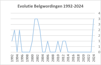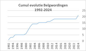 Evolutie Belgwordingen per decennium en 33 jaar |