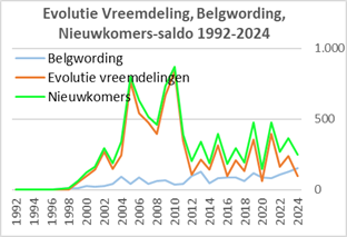 Evolutie vreemdelingen per decennium en 33 jaar |