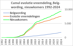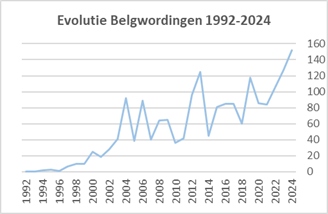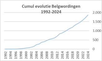 Evolutie Belgwordingen per decennium en 33 jaar |