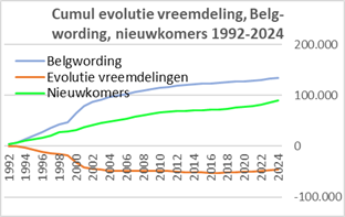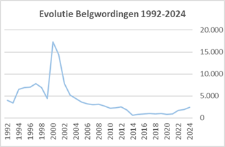 Evolutie Belgwordingen per decennium en 33 jaar |