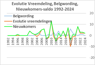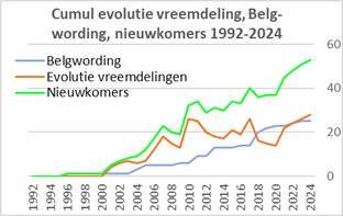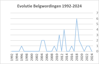 Evolutie Belgwordingen per decennium en 33 jaar |