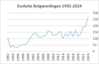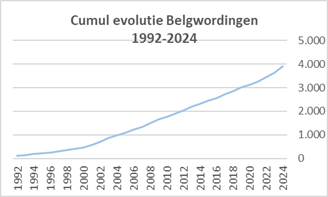 Evolutie Belgwordingen per decennium en 33 jaar |