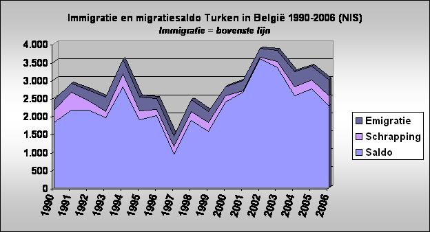 Immigratie en migratiesaldo Turken in België 1990-2006 (NIS)